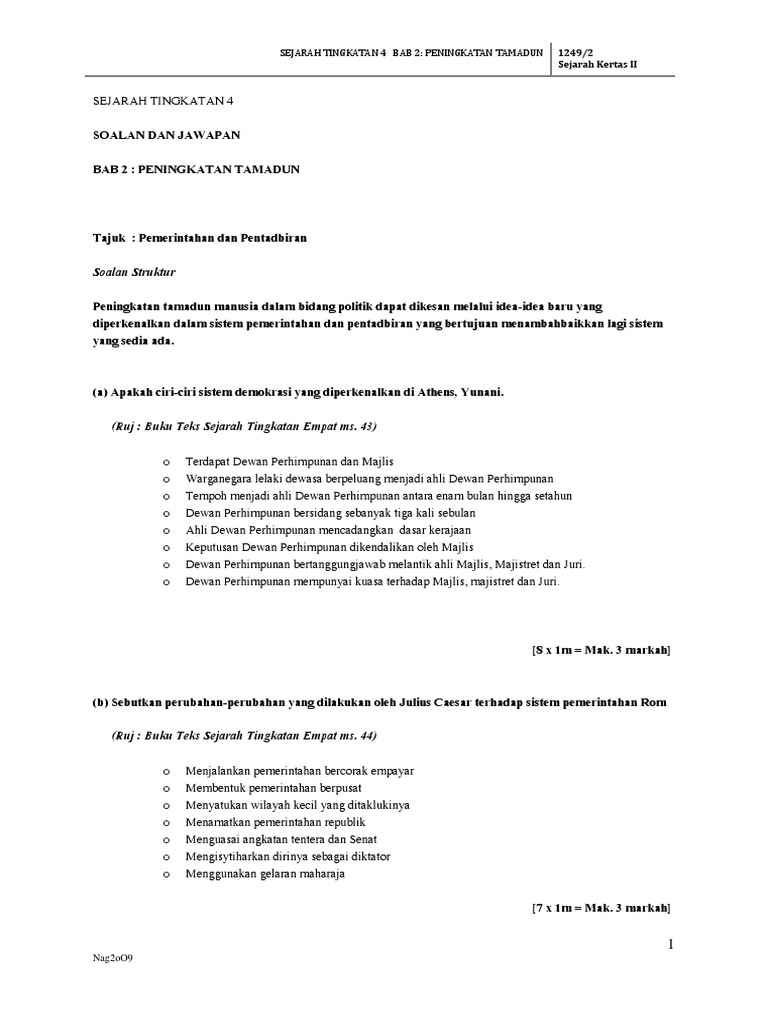 Sejarah nota tingkatan 4 bab 2. Sejarah tingkatan 4 kertas 3 bab 2 soalan dan skema negeri sembilan. Peningkatan tamadun bermaksud penggunaan pemikiran pemikiran manusia untuk untuk mengawal dan guna alam sekitar ± bawa kehidupan yang lebih maju dan kompleks ± selain dapat kemahiran bagi hasilkan idea baru serta. Matematik pt3, tingkatan 1, 2, 3: Terdapat 10 bab utama yang murid perlu kuasi. Skema jawapan peningkatan tamadun, contoh soalan dan kerangka jawapan sejarah kertas 3 spm tingkatan 4 bab 2 bertajuk peningkatan peraturan pemarkahan tingkatan 4 bab 2. Tamadun awal manusia tajuk7.1 (b): Tamadun awal manusia terus berkembang kerana masyarakat sentiasa berusaha untuk 6. Peningkatan tamadun 1249/2 sejarah kertas ii sejarah tingkatan 4 soalan dan jawapan bab 2 : Kemampuan manusia menggunakan pemikiran mereka untuk menggunakan alam sekitar untuk membentuk jelaskan peningkatan ekonomi yang berlaku di tamadun india. Tingkatan 5 bab 2 kertas 3. Perkembangan pesat ekonomi di india mewujudkan persatuan perdagangan (sresthin). Untuk melihat topik pelajaran yang lengkap dengan lebih banyak animasi dan latihan interaktif, layari learningport.com.my/ dan daftar masuk untuk dapatkan percubaan percuma selama 30 hari.